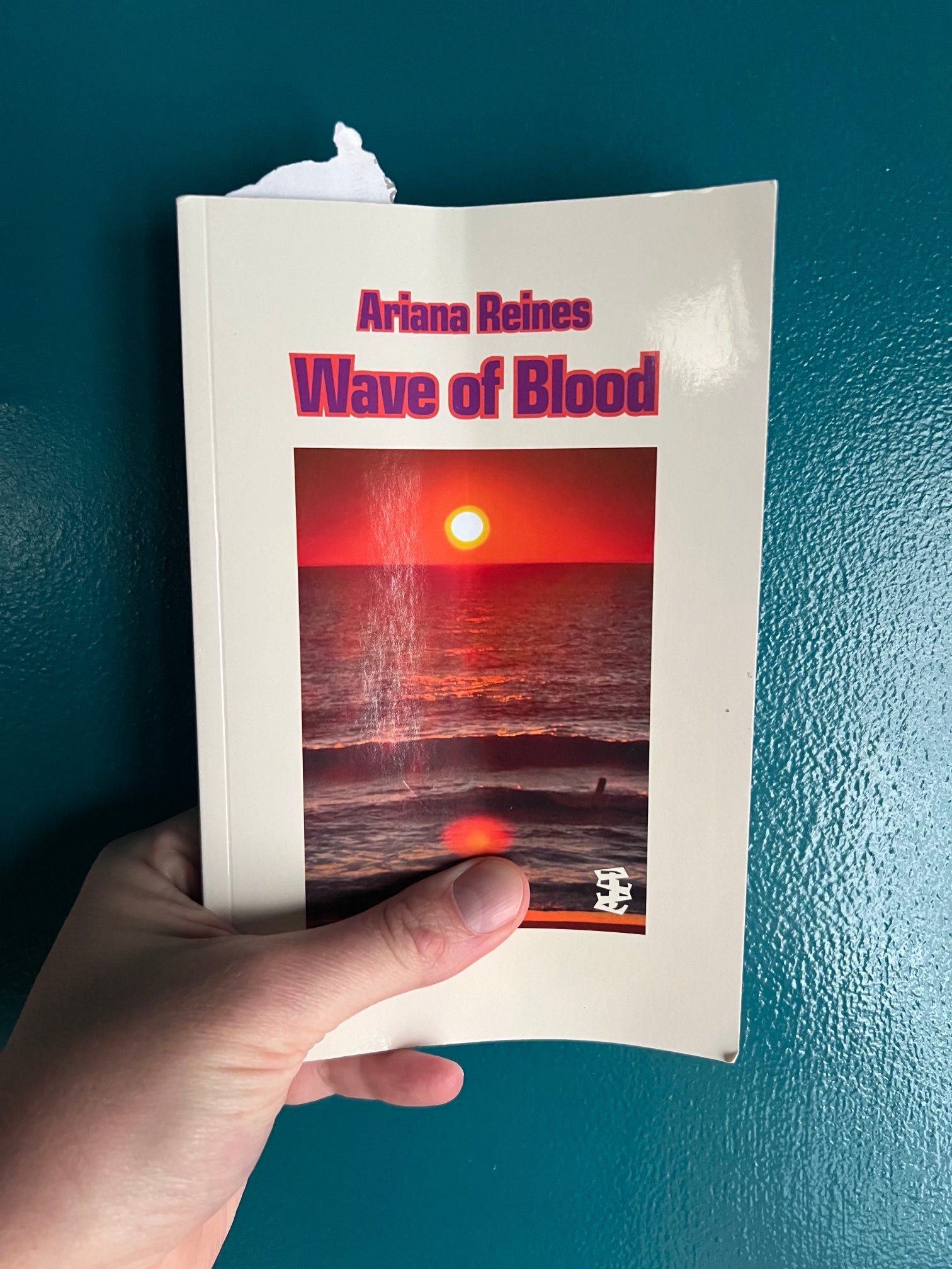 Whatever the case, everything Ariana Reines publishes is a must-read. Wave of Blood arrived in my mailbox the day after I realized it exists. The copy I got looked like it had been folded width-wise down the middle, creasing it distinctly. The impression of that bending only extended past the cover for about 40 pages. Past that, there was no bend.